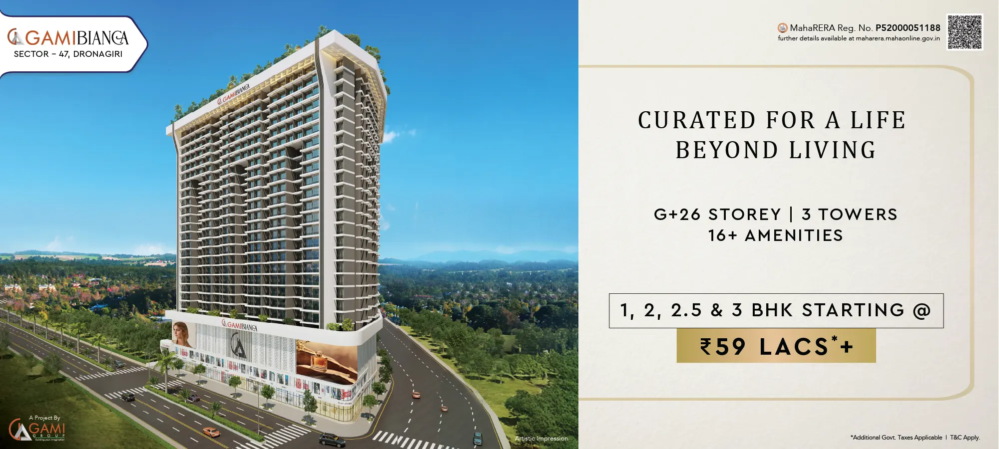 As the tallest tower in the neighborhood, Gami Bianca introduces residents to a truly holistic lifestyle experience. For the first time in Dronagiri, enjoy the convenience of in-campus retail stores, unparalleled amenities, and thoughtfully designed spacious living spaces. Bask in the tranquility of serene sea views from the comfort of your home. Gami Bianca stands as a landmark, blending modern luxury with everyday convenience, ensuring a unique living experience that caters to all your needs.